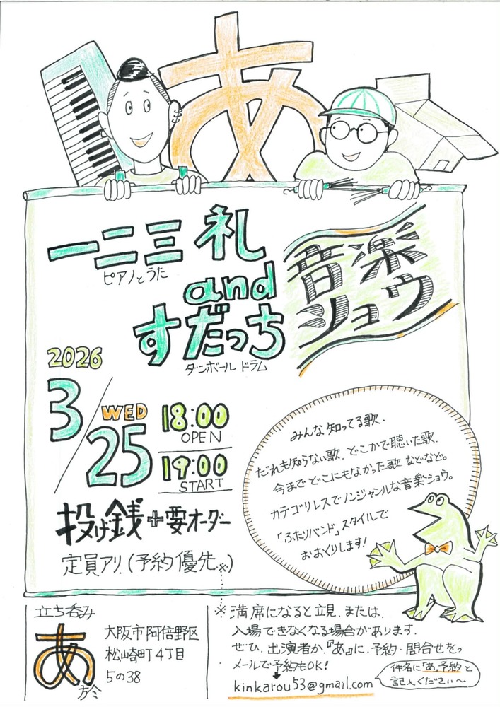 ※予約ナシの方はお立見か、満員の場合は御入場できない可能性があります。
